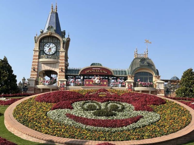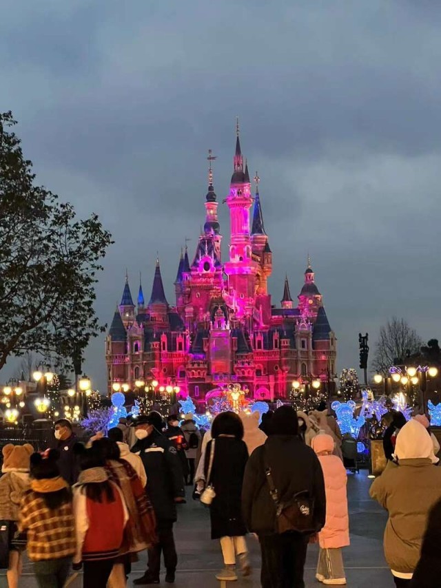 1月16日,换上新春装扮的上海迪士尼,无论是阳光下的卡通花坛,还是夜色里的粉紫色城堡,都吸引着游客们前往游览。(中国青年报·中青在线记者 何欣 摄)