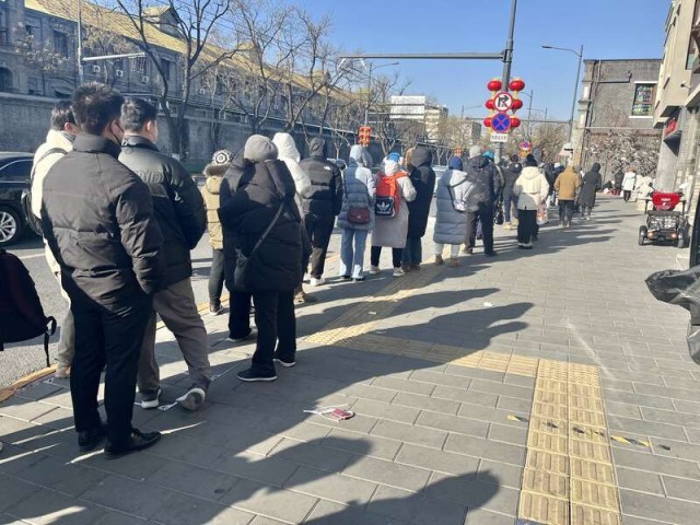 1月16日,北京稻香村0号店大门外,延绵百米的队伍引发了路人好奇,到底什么年货如此吸引人?原来,是稻香村推出的兔年九宫格点心,造型漂亮、做工精致,价格却很有亲和力,排长队也要抢的年货非它莫属!(李师荀 摄)