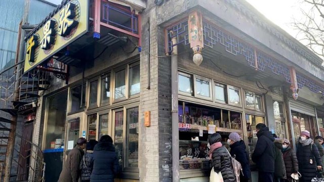 1月18日,北京人气店铺干果张(簋街店)外,排满了采购糖炒栗子、各类干果炒货的人们,价格实惠、食品接地气儿,是这类店铺长盛不衰的最大秘诀。(中国青年报·中青在线见习记者 陈戈辉 摄)