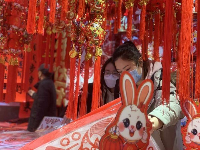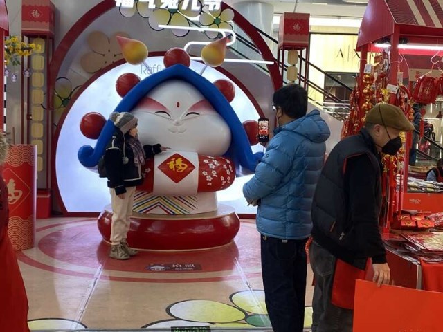 1月15日,北京东直门来福士中心,商家摆起年货摊位,引得顾客驻足挑选。有些消费者还与胖乎乎的“兔儿爷”合影留念起来。(中国青年报·中青在线见习记者 陈戈辉 摄)