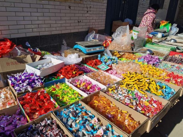 1月15日,河北保定的农村大集上,各种口味的零食糖果供应充足。(中国青年报·中青在线记者 张胶 摄)