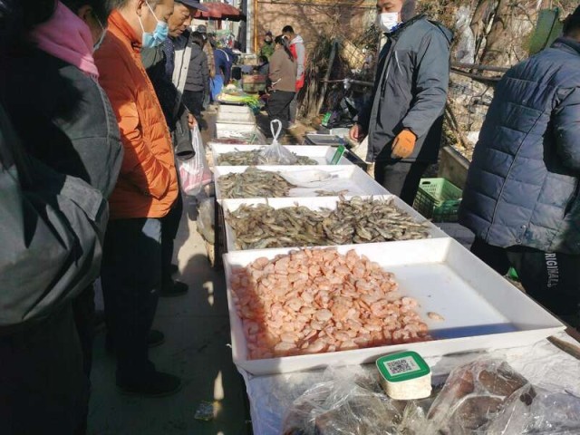 1月15日,河北保定的农村大集上,鱼、虾等海产品种类丰富,摊主吆喝着招揽生意,微信收款码摆在摊位旁边,为支付提供了便利。(中国青年报·中青在线记者 张胶 摄)