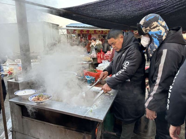 1月18日,山东威海,在张村“黄河大集”上,手掌大的海参、热气腾腾的羊肉汤、鲜香肥美的牡蛎等各种年货琳琅满目,人们赶大集、备年货,共迎新春佳节。图为一羊肉汤摊主正在为顾客熬制羊汤。(中国青年报·中青在线记者 董志成 摄)