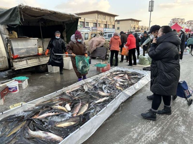 1月18日,山东威海,在张村“黄河大集”上,一海鲜摊主正在补充现捞的活鱼。(中国青年报·中青在线记者 董志成 摄)
