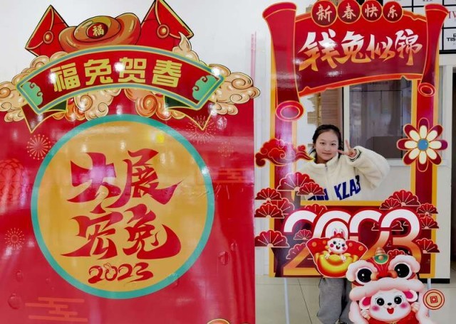 1月15日,在陕西省韩城市一家超市门口,以兔年春节为主题的布景前,吸引了一位小顾客驻足拍照。(中国青年报·中青在线记者 郭艳丽 摄)