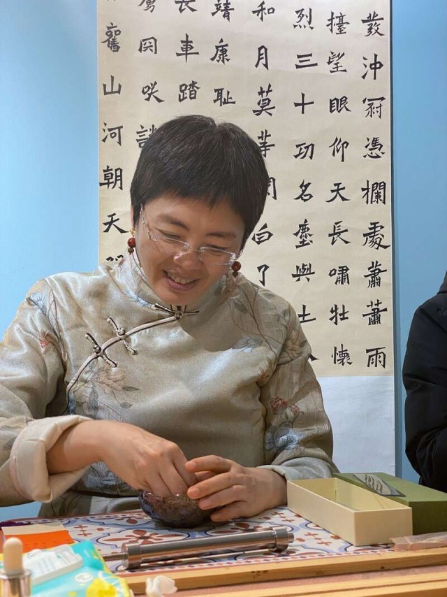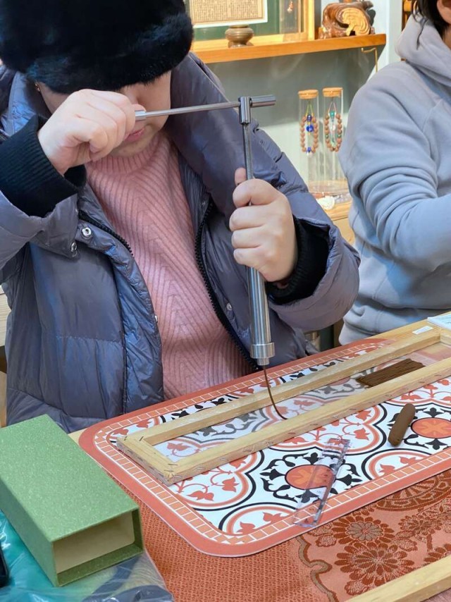 1月14日,北京前门杨梅竹斜街的祈润香舫小店里,香友们聚在一起手作鹅梨线香。美好的愿望和天然的香材融为一体,为新年增添了甜美香韵,同时又散发着文人审美的典雅气息。(柴明霞 摄)
