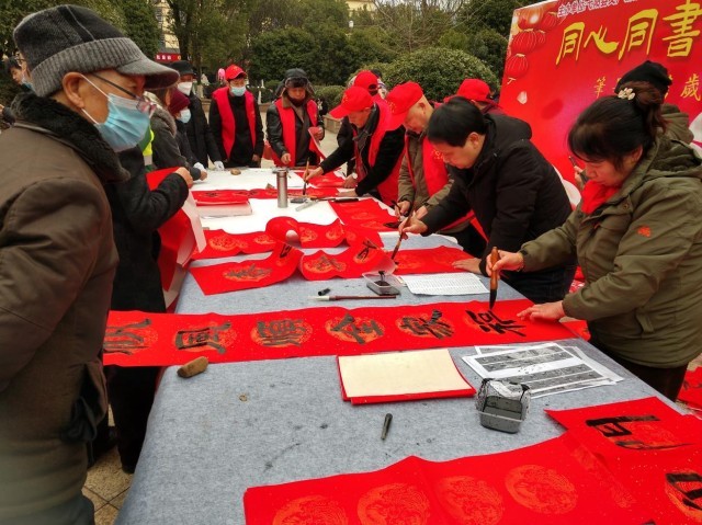 1月17日,江西省上饶市弋阳县文广新旅局、弋阳县文联组织书法家们走进弋阳县方志敏广场、桃源街道社区,挥毫泼墨为当地居民写“福”字和春联,现场一派浓浓的新春喜庆气氛。(邱颖莉 摄)