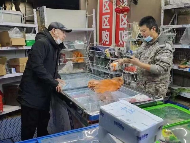 驿站的另一边,郝刚也在为其他邻居提取冰鲜物品,当被问及“什么时候回家过年”、“驿站春节休息几天”等问题时,性格豪爽的郝刚呵呵笑着说:“大家放心,今年春节不打烊,驿站每天都开门,我来盯着,他们娘儿几个回家过年就好了。”听到这话的邻居,纷纷为夫妻俩点赞,称他们是小区邻居的贴心人。而郝刚与贾雪只是报以淡淡微笑,继续忙个不停。(中国青年报·中青在线记者 齐琪 摄)