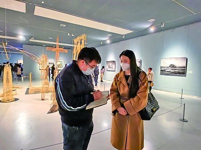 记者冯帆(左一)在山东美术馆采访“共生世界——2022济南国际双年展”观展游客。张楚杭摄/光明图片