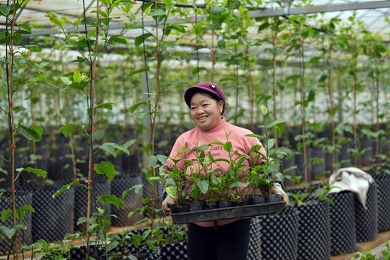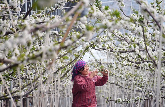 2月7日,在山东省淄博市沂源县燕崖镇燕崖村,果农在大棚里为大樱桃花授粉。早春时节,各地农民积极投入到农事劳动中,田间地头一派繁忙景象。赵东山/摄(新华社发)