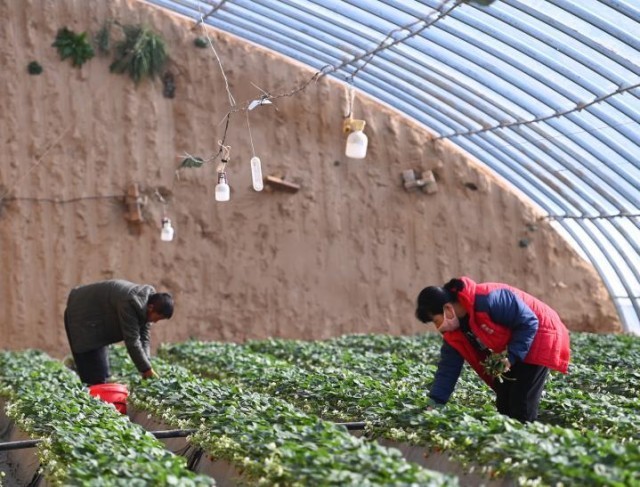 延安市宝塔区河庄坪镇村民杜延峰与妻子正在忙着摘草莓。新华社发(邹竞一 摄)