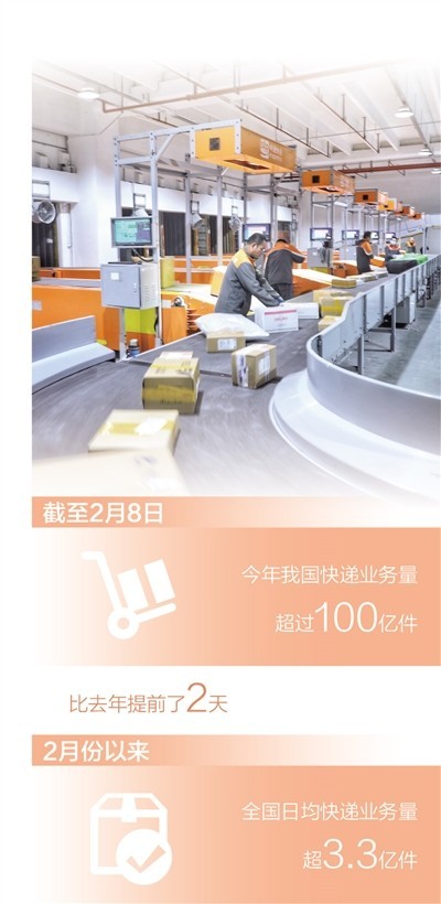 截至2月8日,今年我国快递业务量超过100亿件,比去年提前了2天。