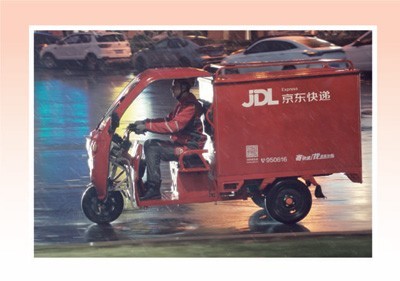 陕西西安,京东快递员夜间冒雨送货。郎 超摄(人民视觉)