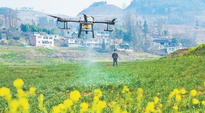 南国沃野。长江西陵峡畔,油菜春管正当时。2月9日,湖北省宜昌市夷陵区南垭村1000亩的油菜花田,4台无人机飞旋喷洒肥料。“无人机施肥,省时省力,又节水省肥,还能提高产量,一举两得。”南垭村种粮大户杨倩说。