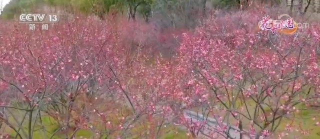 我们现在看到的这片梅花林面积并不算大,但是人气却很旺,可以说当地热门的春景打卡地之一,游客最多一天能达到2万多人次。首先,这里的梅花多彩多姿,它美得层次分明。这里有宫粉梅、玉碟梅、绿萼梅、朱砂梅、洒金梅等十多个品种,红色、粉色、白色、绿色相间,不仅渲染出了多彩的春景,而且有的清雅、有的娇艳、有的梦幻,也满足了不同人审美的喜好。另外,这里的梅林和河流、桥梁、铁路等相互映衬,移步换景美得特别,比如说我们调整视角,从不远处的习友路大桥上俯瞰,感受到的是红粉相间的舒朗大气。再转个视角,还会看见列车穿过梅花林,驶过一片春意盎然景象。所以,有不少人特意带着装备守候在这里,希望能拍下开往春天的列车的美景。