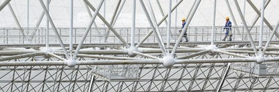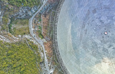 2月13日,工作人员从“中国天眼”的圈梁上经过。