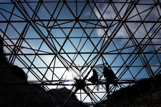 2月13日,工作人员对“中国天眼”的反射面板进行维护保养(维护保养期间拍摄)。新华社记者 欧东衢 摄