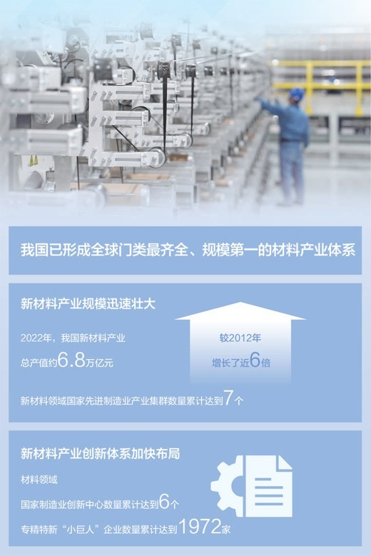 产业规模迅速壮大。2022年,我国新材料产业总产值约6.8万亿元,较2012年增长了近6倍。新材料领域国家先进制造业产业集群数量累计达到7个。