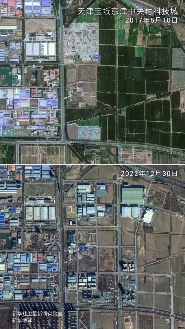 卫星拍摄的天津宝坻京津中关村科技城前后对比图。