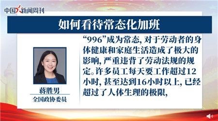 全国政协委员、编剧蒋胜男建议加强劳动法对劳动者的休息权保护,对企事业单位八小时工作制的执行情况加强监督管理。