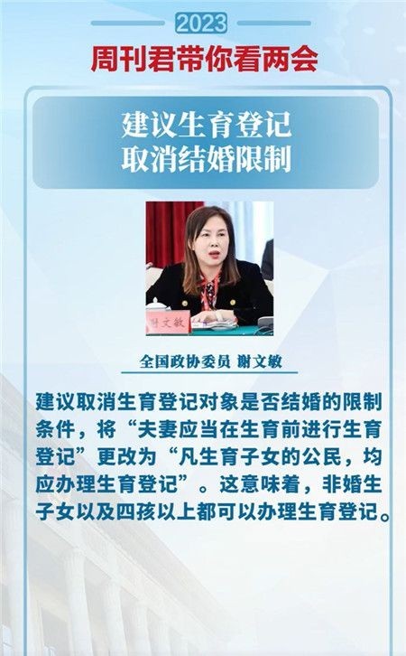 谢文敏建议,取消生育登记对象是否结婚的限制条件,将“夫妻应当在生育前进行生育登记”更改为“凡生育子女的公民,均应办理生育登记”。这意味着,非婚生子女以及四孩以上都可以办理生育登记。