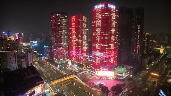 “智创未来”强国青年创业者寻访活动期间,广东省佛山市禅城区城市中心地标亮灯致敬“强国青年创业者”。禅城区委宣传部供图