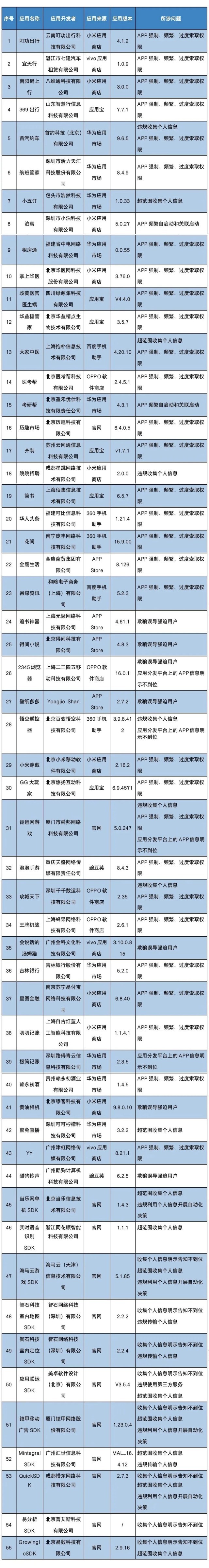 工信部3月21日对叮功出行、宜天行等55款侵害用户权益的移动互联网应用程序(APP)及第三方软件开发工具包(SDK)进行通报,要求这55款APP及SDK按有关规定进行整改。