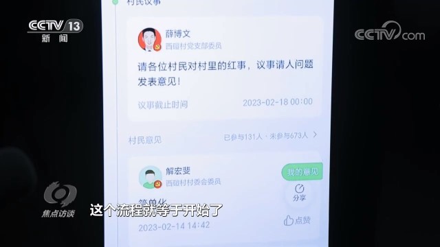 这是西磑村一起由村民在网上发起的“村民说事”,议事全程在一个名叫“村级事务管理平台”的微信小程序上办理,只用了5天的时间,红事前议事不摆宴席就形成了决议,写进了西磑村的《村规民约》。