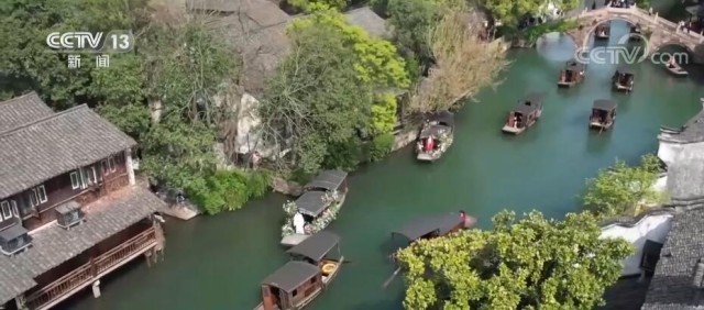 总台记者 李欣蔓:我们所在的位置是乌镇西栅景区的主河道。这两天随着游客量的增加,可以看到这里是非常繁忙。就在我们身边开过去的两艘船有点不一样,船身布满了各种各样的花朵,这就是正在进行的花船巡游。我们了解到也是为了丰富游客的游玩体验,乌镇景区在近两个月陆续推出各类活动。除了花船巡游,您来到这里还能看到踏白船等一系列非遗项目的表演。