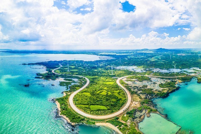 这是2022年10月6日在海南儋州峨蔓火山海岸拍摄的海南环岛旅游公路(无人机照片)。新华社记者 蒲晓旭 摄