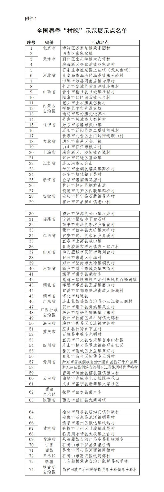 央视网消息:据文化和旅游部网站消息,根据《文化和旅游部办公厅关于开展“四季村晚”活动的通知》(办公共发〔2023〕52号)要求,文化和旅游部公共服务司在各省级文化和旅游行政部门申报推荐的基础上,经研究,确定春季“村晚”主会场设在四川省宜宾市、夏季“村晚”主会场设在云南省丽江市、秋季“村晚”主会场设在江西省九江市、冬季“村晚”主会场设在浙江省丽水市、广西壮族自治区柳州市,并确定了“四季村晚”示范展示点名单,现予以公布。