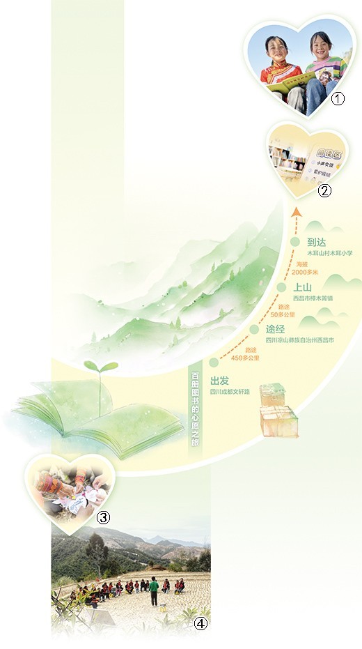 这是一次跨越500多公里的书香传递。100个心愿、100册图书,从四川成都来到西昌市樟木箐镇,来到海拔2000多米的木耳山上,送到300多名孩子的手中。