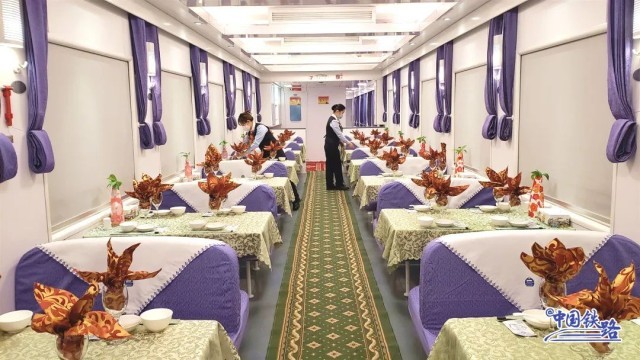 新东方快车旅游专列由13节软卧车厢、2节餐车、1节酒吧车组成。