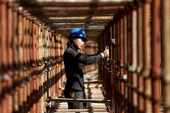 2018年10月1日,江苏淮安快速路一期工程建设工地上,建设工人们坚守岗位。视觉中国供图(资料图片)