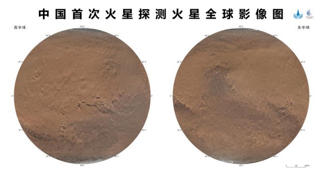 这是4月24日发布的火星东西半球正射投影图。当日,在2023年“中国航天日”主场活动启动仪式上,国家航天局和中国科学院联合发布了中国首次火星探测火星全球影像图。新华社发(国家航天局供图)