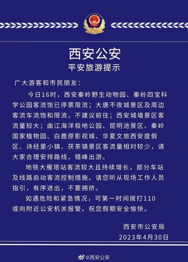 4月30日,西安多个景区停票限流。西安公安果断发布旅游提示,不建议游客前往大唐不夜城,提示游客合理安排路线,错峰出游。