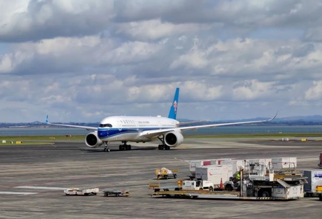3月3日,搭载中国团队游客的中国南方航空公司班机抵达新西兰奥克兰国际机场。新华社发(程麒麟 摄)