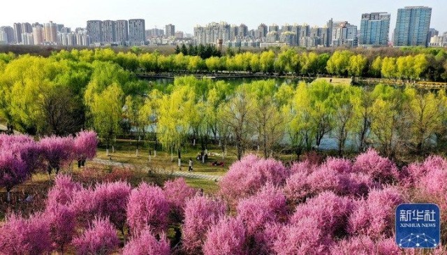 西安大明宫国家遗址公园内的美人梅连片盛开(3月14日摄,无人机照片)。新华社记者 刘潇 摄