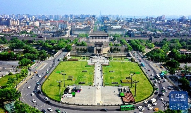 西安城墙景区永宁门文化广场(4月25日摄,无人机照片)。新华社记者 刘潇 摄