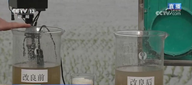 下一步就是对盐碱地进行改良,主要任务就是降低土壤的pH值。您看,这就是当地的盐碱土,颜色雪白,而且非常硬。这样的土壤泡水之后我们来测量一下它的pH值是多少,是在10—12区间。这是什么概念呢?种植水稻的土壤最佳是在7左右,它已经接近于2倍的数值。而通过向土壤当中施加改良剂,不断泡田洗田,逐年种植水稻,这一杯是我们刚才从水田当中取出的土样,我们来测量一下它的pH值,您看已经降低到了7左右,改良效果是非常明显。但这些还不够,改良之后的盐碱地如果长时间浸泡还会出现返碱的现象,因此当地三天两头就需要有人拿着这样的试纸挨个田块进行测量,但是现在使用智能检测系统,可以实时控制进水排水。您看如果达到标准,水阀不会打开,但是如果出现了返碱的情况,超过了临界值,水阀会自动打开进行排水,为水稻提供适宜的生长环境。