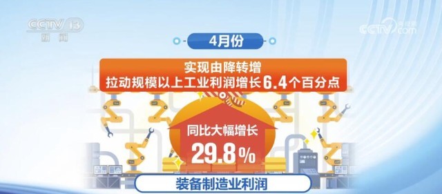 装备制造业利润明显恢复。4月份,装备制造业利润同比大幅增长29.8%,实现由降转增,拉动规模以上工业利润增长6.4个百分点。其中,汽车行业利润增幅最大,较去年大幅增长20.4倍,电气机械行业及通用设备行业利润恢复明显,分别增长37.5%和63.7%。