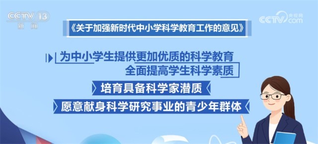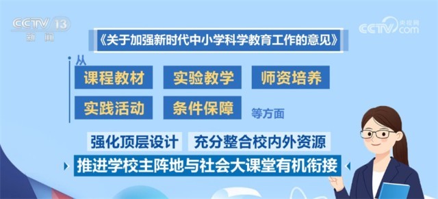 作为全面部署新时代中小学科学教育的专门文件,《意见》从课程教材、实验教学、师资培养、实践活动、条件保障等方面强化顶层设计,充分整合校内外资源,推进学校主阵地与社会大课堂有机衔接,为中小学生提供更加优质的科学教育,全面提高学生科学素质,培育具备科学家潜质、愿意献身科学研究事业的青少年群体。