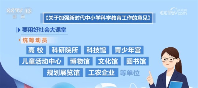 《意见》强调,要用好社会大课堂。统筹动员高校、科研院所、科技馆、青少年宫、儿童活动中心、博物馆、文化馆、图书馆、规划展览馆和工农企业等单位,向学生开放所属的场馆、基地、营地、园区、生产线等阵地、平台、载体和资源。鼓励高校和科研院所主动对接中小学,引领科学教育发展。