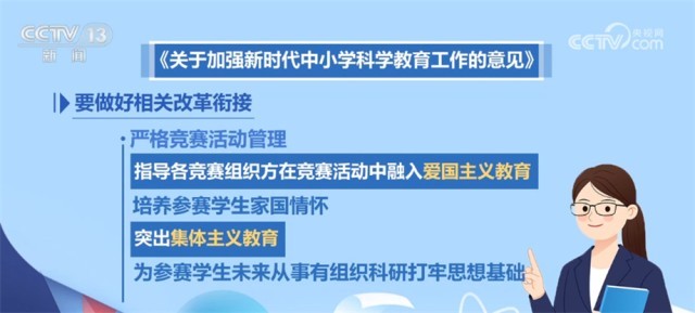 《意见》要求,要做好相关改革衔接。严格竞赛活动管理,指导各竞赛组织方在竞赛活动中融入爱国主义教育,培养参赛学生家国情怀;突出集体主义教育,为参赛学生未来从事有组织科研打牢思想基础。明确“中学生英才计划”“强基计划”等项目在选拔、培育、使用上的各自侧重点。推进中高考内容改革,坚持素养立意,强化实验考查,提高学生动手操作和实验能力。