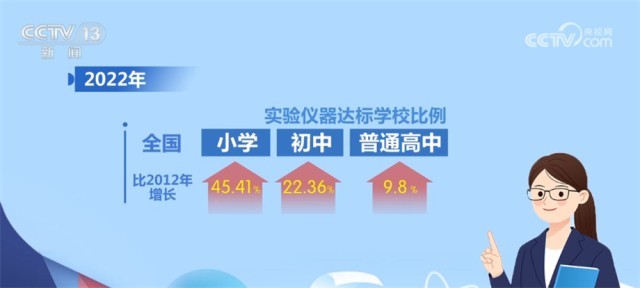 如今,我国一至九年级均已开设科学课,独立设置信息科技、劳动课程。2022年,全国小学、初中、普通高中实验仪器达标学校比例比2012年分别增长45.41%、22.36%、9.8%。