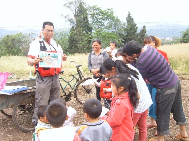 杨海龙参与四川雅安地震救援时,给小朋友做卫生宣传。(受访者供图)