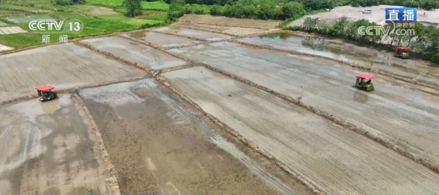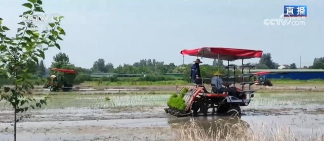 总台记者 刘军:我现在就是在安徽合肥市肥西县严店镇三元村。在我身旁的这块田里,几台插秧机正在田里忙着插秧。每台插秧机上都有两名操作手,一个驾驶插秧机,一个来装填苗盘,随着插秧机的行进,一株株翠绿的秧苗从苗盘分离,被整齐地栽种到田里。有人可能会问,为什么不直接把水稻种子种在田里呢?这是因为,通过育秧可以让秧苗成长到足够强壮后,再移植到大田里,这样能大大提高水稻秧苗的成活率,同时减少发病率,为水稻高产、稳产打下基础。