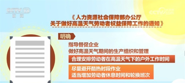 《通知》明确,指导督促企业做好高温天气期间的生产组织和管理,合理安排劳动者在高温天气下的户外工作时间,尽量避开酷热时段作业,适当增加劳动者休息时间和轮换班次。