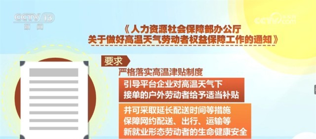 央视网消息:近日,人力资源和社会保障部就做好高温天气劳动者权益保障工作印发《通知》。其中,对快递、外卖人员等灵活就业人员的高温天气下如何保障做出了专门的要求。