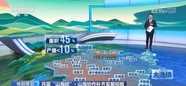 但在浙江省内,同样存在发展不均衡的问题。我们说浙江是“七山一水二分田”,地势自西南向东北倾斜。这条线叫做“清大线”,它北起杭州市临安区清凉峰镇,南到温州市苍南县大渔镇。它也是浙江发展水平的一条分界线,因为线的两侧,东北临海,西南靠山。山区26县占浙江省45%的面积,却只创造了不到10%的生产总值。这种差距,浙江把它总结为“山海”差距。
